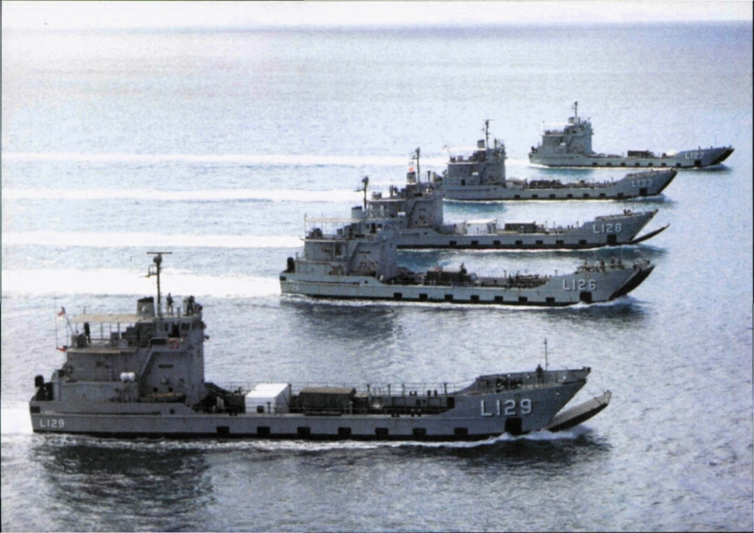 3艘LCU-1466级多用途登陆艇,原为美日许可生产的登陆艇,满载排水量约360 吨,船长约36.28 米,推进系统为3台柴油发动机,最高航速约10 节,续航约700 海里,可运输重约150 吨的车辆和货物。